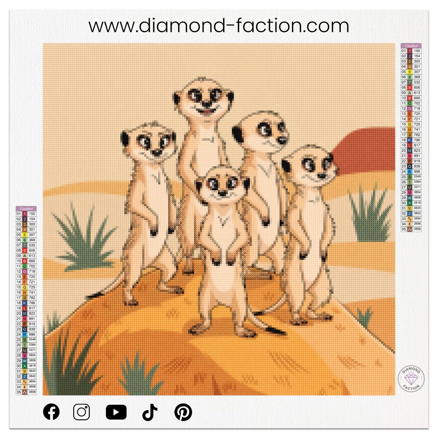 Appreciate conviviality and curiosity with this Diamond embroidery representing a family of meeries. This kit of Diamond Painting offers you a creative and relaxing moment, perfect for animal and savannah scenes. Each meticulous detail captures the liveliness and cohesion of this family, bringing a touch of cheerfulness and energy to your interior decoration.