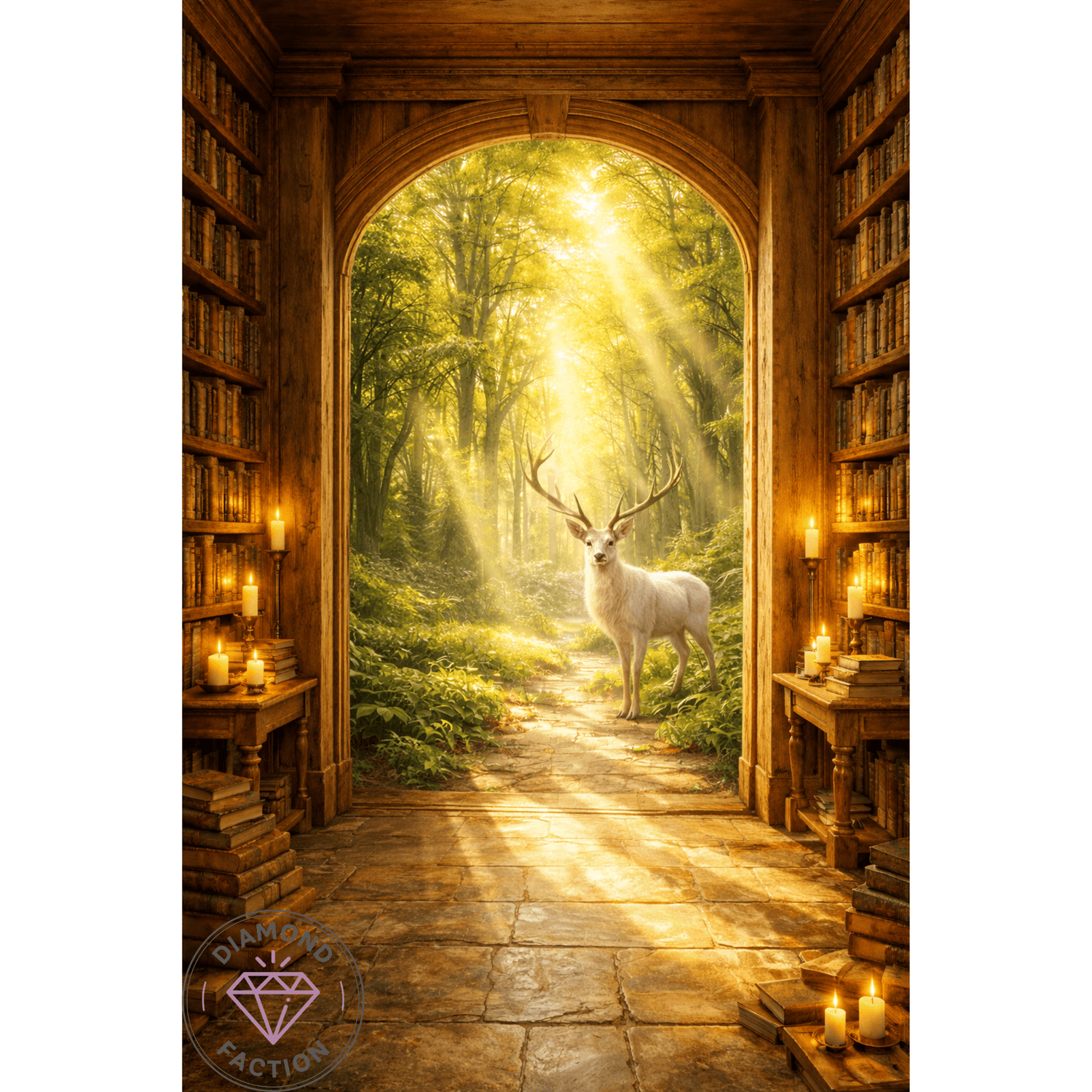 The Lost Library reveals an enchanted forest bathed in light, guarded by a white stag, a symbol of calm and wisdom.